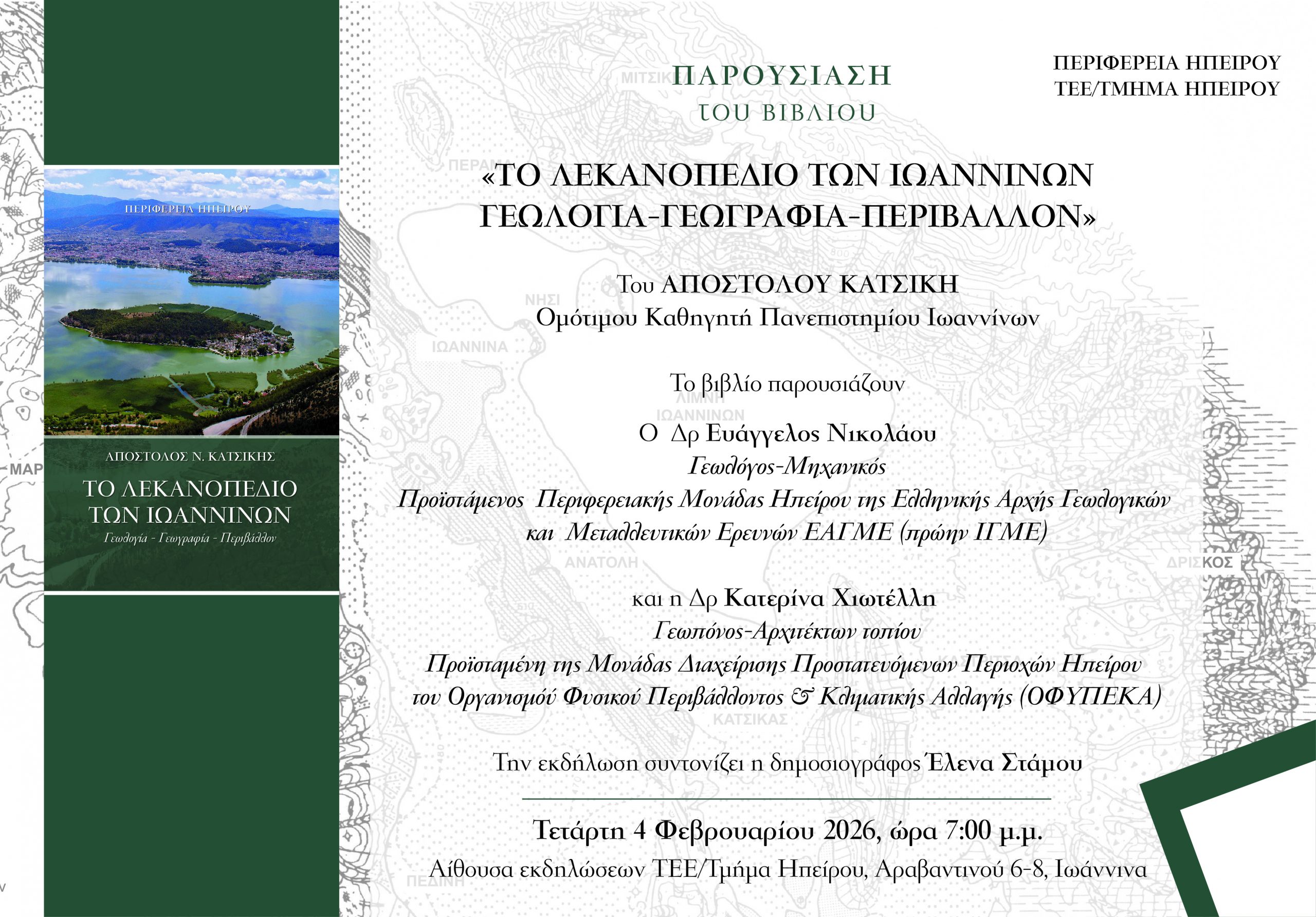 Παρουσίαση του βιβλίου “ΤΟ ΛΕΚΑΝΟΠΕΔΙΟ ΤΩΝ ΙΩΑΝΝΙΝΩΝ ΓΕΩΓΡΑΦΙΑ - ΓΕΩΛΟΓΙΑ -ΠΕΡΙΒΑΛΛΟΝ" του απόφοιτου της Ζωσιμαίας Σχολής Απόστολου Κατσίκη.