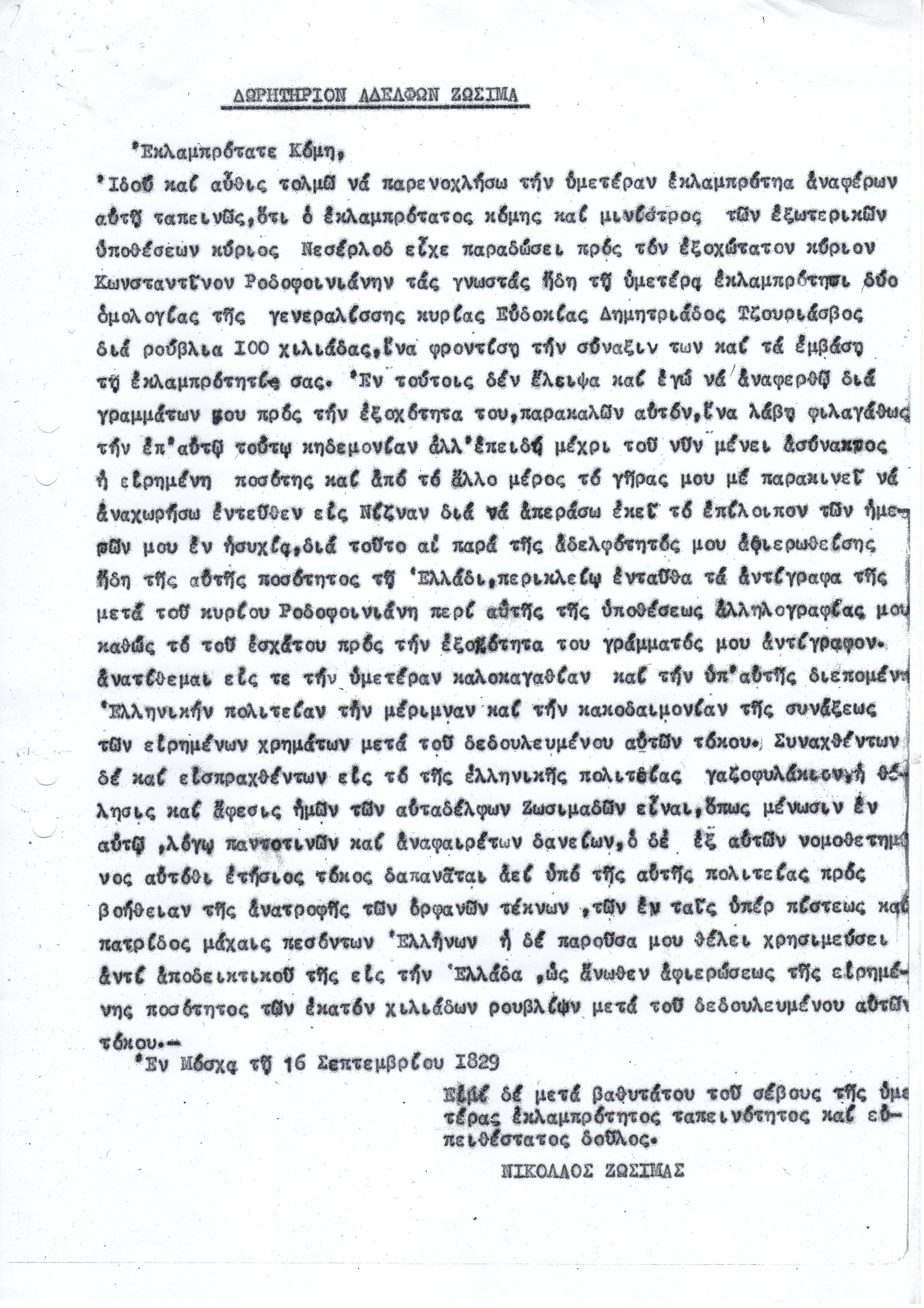 Με την επιστολή που συνέταξε στη Μόσχα την 16 Σεπτεμβρίου 1829, ο Νικόλαος Ζωσιμάς απευθύνεται,  στον «Εκλαμπρότατον Κόμη», τον ενημερώνει για το ιστορικό των γραμματίων και τα διαδικαστικά θέματα είσπραξης των χρημάτων και  του ζητάει όπως «συνταχθέντων δε και εισπραχθέντων εις το της Ελληνικής Πολιτείας Γαζοφυλάκιον, η θέλησις και έφεσις ημών των  αυταδέλφων Ζωσιμάδων είναι όπως μένουσι εν αυτώ εν λόγω παντοτεινών και αναφαιρέτων δανείων, ο δε εξ αυτών νομοθετημένος αυτόθι ετήσιος τόκος, δαπανάται αεί υπό της αυτής πολιτείας προς βοήθειαν της ανατροφής των ορφανών τέκνων των εν τοις υπέρ πίστεως και πατρίδος μάχαις πεσόντων Ελλήνων». Για να έχουμε δε μία συγκριτική εικόνα του οικονομικού μεγέθους των 100.000 ρουβλίων, επισημαίνουμε ότι το ποσό αυτό αντιστοιχεί στο 10% των χρημάτων του Κληροδοτήματος Ζωσιμάδων (Διαθήκη Νικολάου Ζωσιμά).