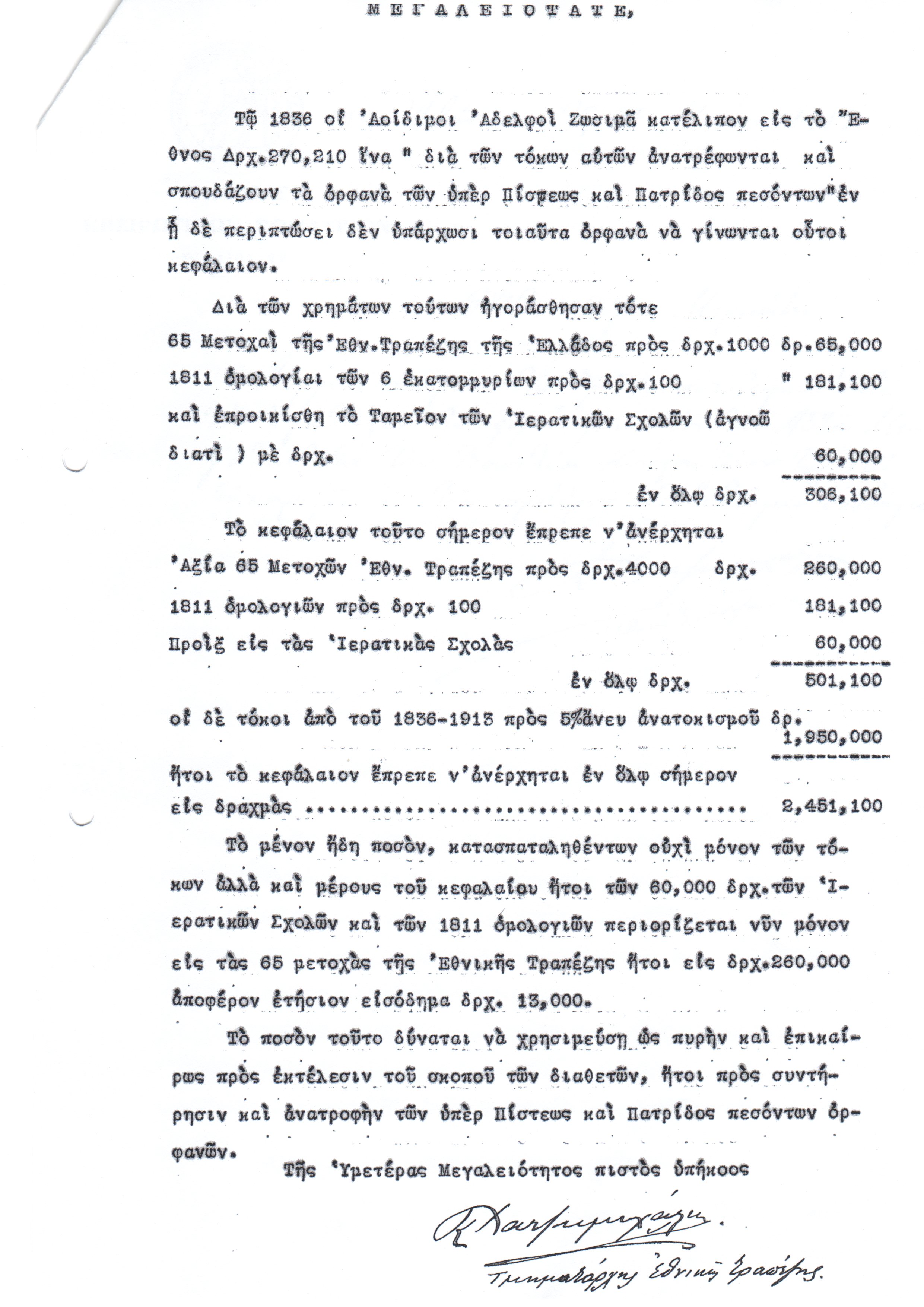 • Είναι προφανές ότι η ίδια τακτική ακολουθήθηκε και μετά το 1842, σύμφωνα δε με την μαρτυρία του Κ. Χατζημιχάλη “το μένον ήδη ποσόν, κατασπαληθέντων ουχί μόνον των τόκων αλλά και μέρους του κεφαλαίου ήτοι των 60.000 δραχμών των Ιερατικών σχολών και των 1.811 ομολογιών περιορίζεται νυν (Σ.Σ.: το 1913) μόνον εις τας 65 μετοχάς της Εθνικής Τραπέζης”! Εκτιμώ ότι ο επιστολογράφος δεν θα αποτολμούσε ποτέ την διατύπωση μιας μομφής “περί κατασπατάλησης των χρημάτων” εάν δεν διέθετε τα αποδεικτικά, περί τούτου, στοιχεία, πολύ δε περισσότερο επειδή η επιστολή δεν απευθύνονταν σε ένα τυχαίο πρόσωπο αλά στον ίδιο τον Βασιλέα. Πιστεύω ότι ο Κ. Χατζημιχάλη βάσισε την καταγγελία του στα στοιχεία που ήταν καταγεγραμμένα στην μερίδα της «δωρεάς» (στοιχεία εισροών και εκροών),