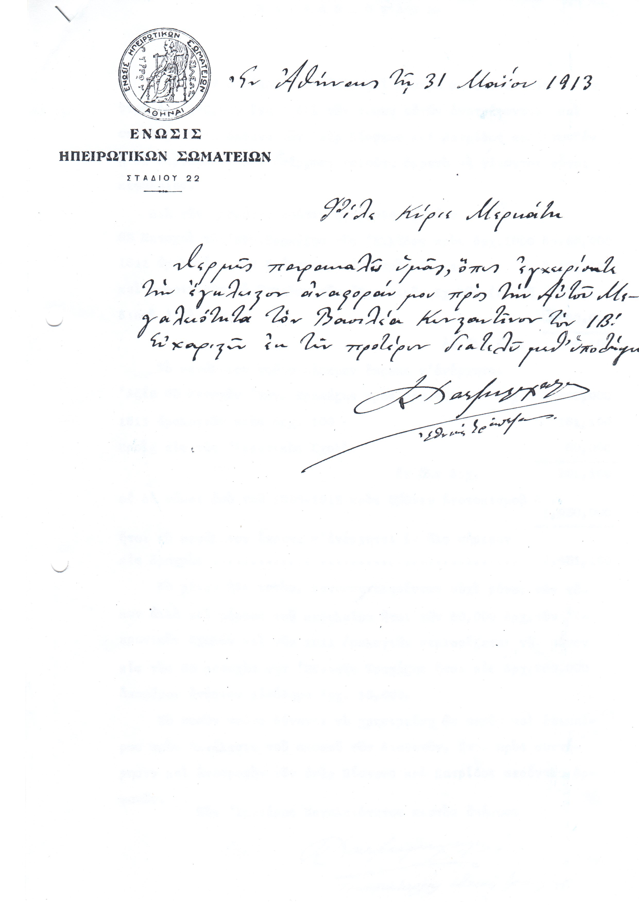 1.   Επιστολή της Ένωσης Ηπειρωτικών Σωματείων Αθηνών