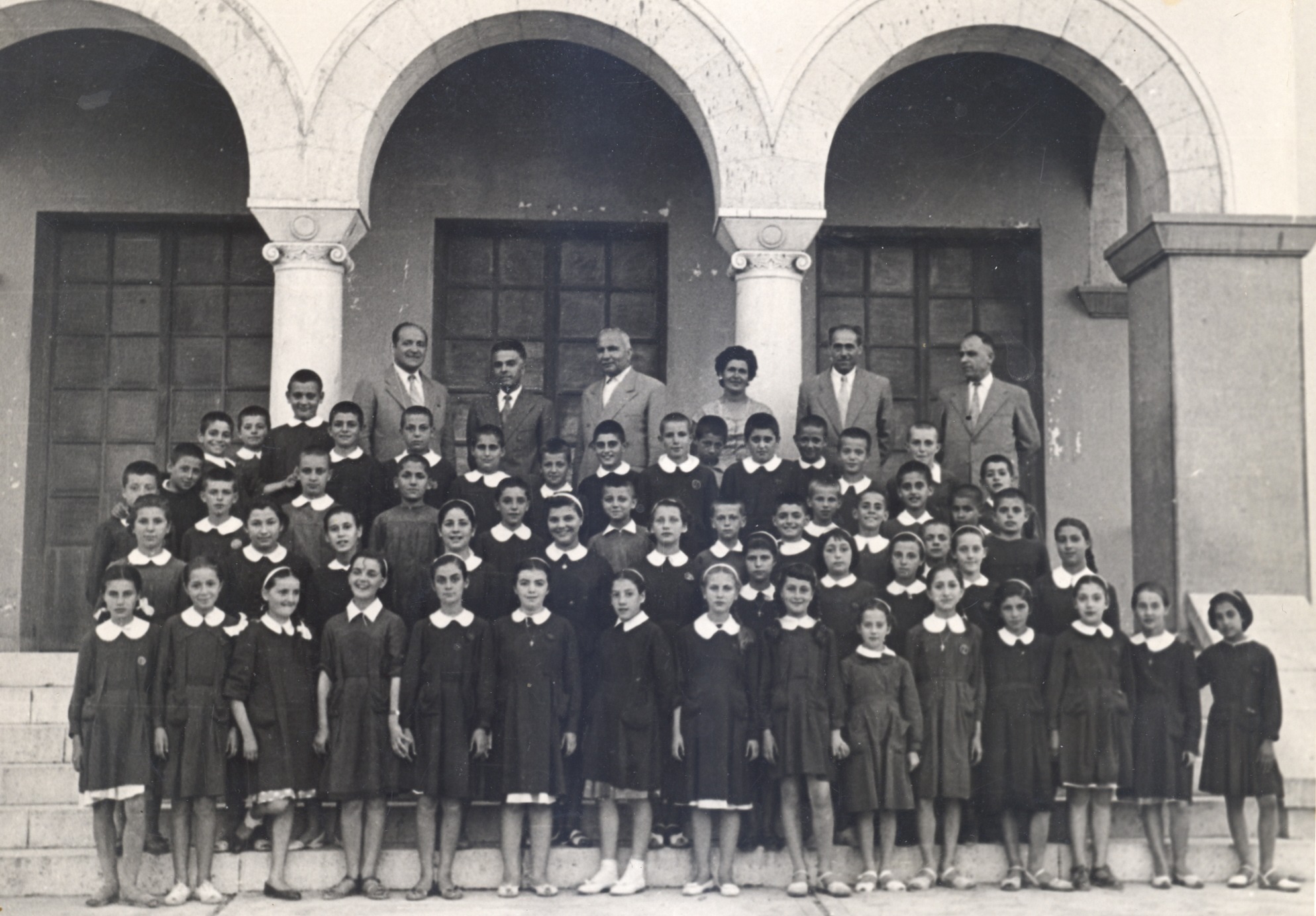 Σ’ αυτή τη φωτογραφία του 1957 αποθανατίζονται οι μαθητές της ΣΤ’ τάξεως του Τετραταξίου και των δύο (2) Μονοταξίων του Προτύπου Δημοτικού σχολείου της Ζωσιμαίας Παιδαγωγικής Ακαδημίας, μαζί με τους δασκάλους τους.