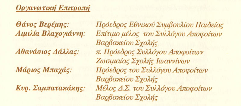 Την έναρξη των εργασιών της Ημερίδας κήρυξε ο εκπρόσωπος τον Υπουργού Παιδείας, Διευθυντής Δευτεροβάθμιας Εκπαίδευσης κ. Αθανάσιος Νικολόπουλος. Παρέστησαν, απηύθυναν χαιρετισμό και τάχθηκαν υπέρ της καθιέρωσης των Προτύπων ο εκπρόσωπος τον Αρχιεπισκόπου Αθηνών και Πάσης Ελλάδος, ο εκπρόσωπος τον Βαρβακείου Κληροδοτήματος και Διευθυντής τον Γραφείου της Προεδρίας της Δημοκρατίας Πρέσβης κ. Κωνσταντίνος Μπίκας και πολλοί απόφοιτοι της Βαρβακείου Σχολής, σημαντικοί παράγοντες της Δημόσιας ζωής οπως: ο πρώην Πρόεδρος τον Συμβουλίου Επικρατείας και σημερινός Πρόεδρος της Αρχής Προστασίας Προσωπικών Δεδομένων κ. Χρήστος Γεραρής, ο Νομάρχης Ανατολικής Αττικής και πρώην Δήμαρχος Αθηνών κ. Λεωνίδας Κουρής, ο εκδότης της εφημερίδας “Απογευματινή” κ. Κώστας Σαραντόπουλος, ο Επίτιμος Αντιπρόεδρος τον Συμβουλίου Επικρατείας κ. Αναστάσιος Μαρίνος, ο Ομότιμος Καθηγητής της Ιατρικής Πανεπιστημίού Αθηνών κ. Ευτύχιος Βορίδης, ο Βουλευτής Αθηνών τον ΠΑΣΟΚ κ. Αθανάσιος Τσούρας και πολλοί άλλοι.