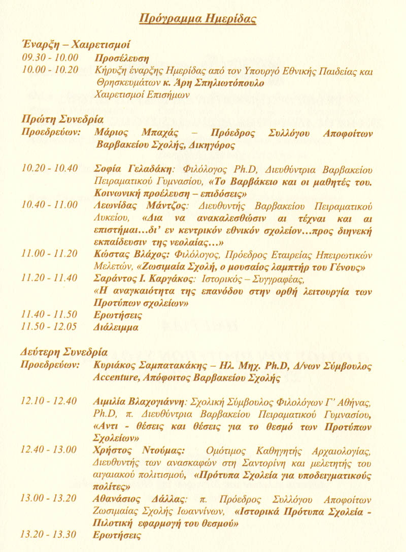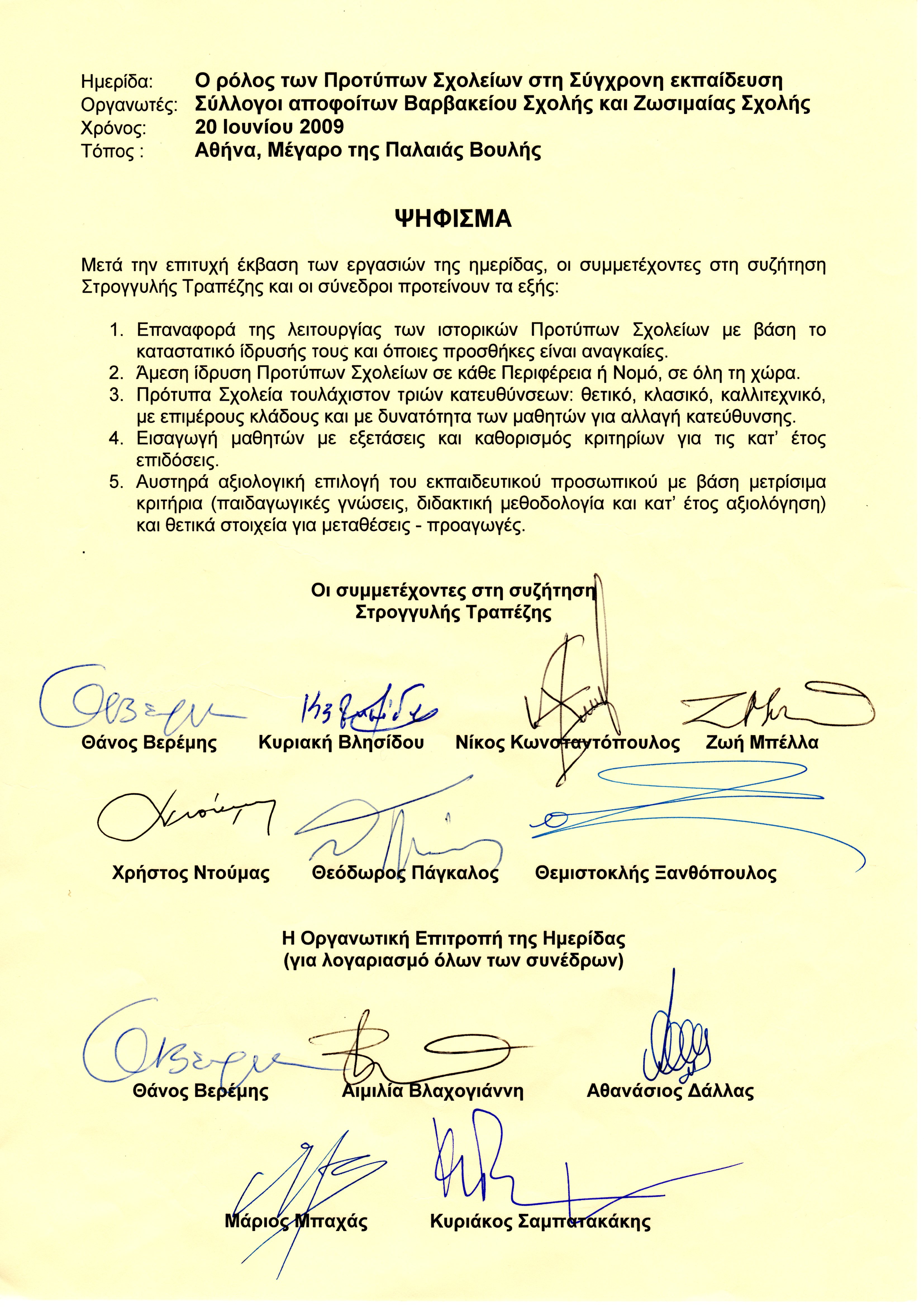 Την ίδια μέρα που εγκαινιάστηκε το Νέο Μουσείο της Ακρόπολης, Σάββατο 20 Ιουνίου 2009, πραγματοποιήθηκε στην ΑΘήνα, στην αίθούσα της Παλαιάς Βουλής, Ημερίδα με θέμα “Ο ρόλος των Προτύπων Σχολείων στη σύγχρονη εκπαίδευση“, που διοργάνωσαν από κοινού οι Σύλλογοι των Αποφοίτων Ζωσιμαίας Σχολή και Βαρβακείού Σχολής. Η επιτυχία της εκδήλωσης ήταν πολύ μεγάλη και, όπως αποδείχτηκε στην συνέχεια, αποτέλεσε την απαρχή θετικών εξελίξεων για την επαναφορά του θεσμού των Δημόσιων Πρότυπων Γυμνασίων και Λυκείων και για την επαναλειτουργία της ιστορικής  Γεραράς Ζωσιμαίας Σχολής.