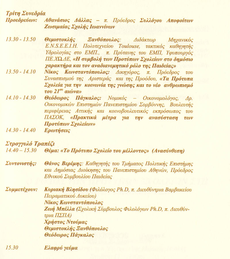 Θεόδωρος Πάγκαλος, Νομικός, Οικονομολόγος, απόφοιτος της Βαρβακείου Σχολής, Δρ Οικονομικών Επιστημών του Πανεπιστημίου της Σορβόννης, βουλευτής Περιφερείας Αττικής, Κοινοβουλευτικός εκπρόσωπος του ΠΑΣΟΚ με θέμα: «Πρακτικά μέτρα για την ανασύσταση των προτύπων σχολείων»