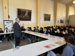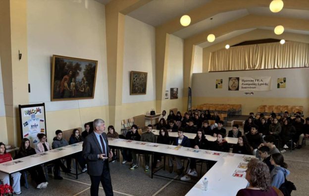 Η Διευθύντρια του σχολείου, κα Καλλιόπη Μπεκιάρη, άνοιξε την εκδήλωση εκφράζοντας τη μεγάλη χαρά και τιμή ολόκληρης της σχολικής κοινότητας για την παρουσία του κ. Φατούρου και υπογράμμισε τη σημασία της ενημέρωσης και της ενεργού συμμετοχής των νέων σε παγκόσμια ζητήματα όπως η αειφορία, η ισότητα και η κοινωνική συνοχή.
