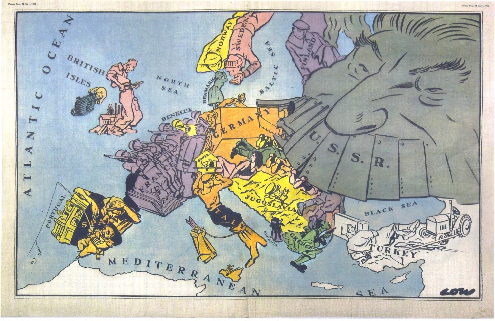 - Χάρτης 5. 1952, ο ψυχρός πόλεµος είναι παρών. «Η Σοβιετική Ένωση µε τη µορφή του Στάλιν καταπίνει ως βαρύ τεθωρακισµένο το σύνολο των κρατών του ανατολικού µπλοκ. Η Γερµανία πριονίζεται στα δύο».