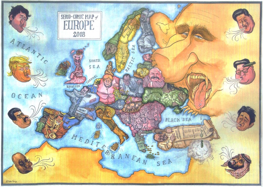 - Χάρτης 6. «Στην Ευρώπη του 2018 οι πρόσφυγες συσσωρεύονται στα Βαλκάνια, Μέρκελ και Τουσκ µετράνε τα Ευρώ, o Πούτιν εποφθαλµιά τις ανατολικές και βόρειες χώρες και βοµβαρδίζει τη Συρία. Η Ελλάδα «ζητιανεύει», ενώ η Ελισάβετ της Αγγλίας κρατά στα χέρια της το Brexit».