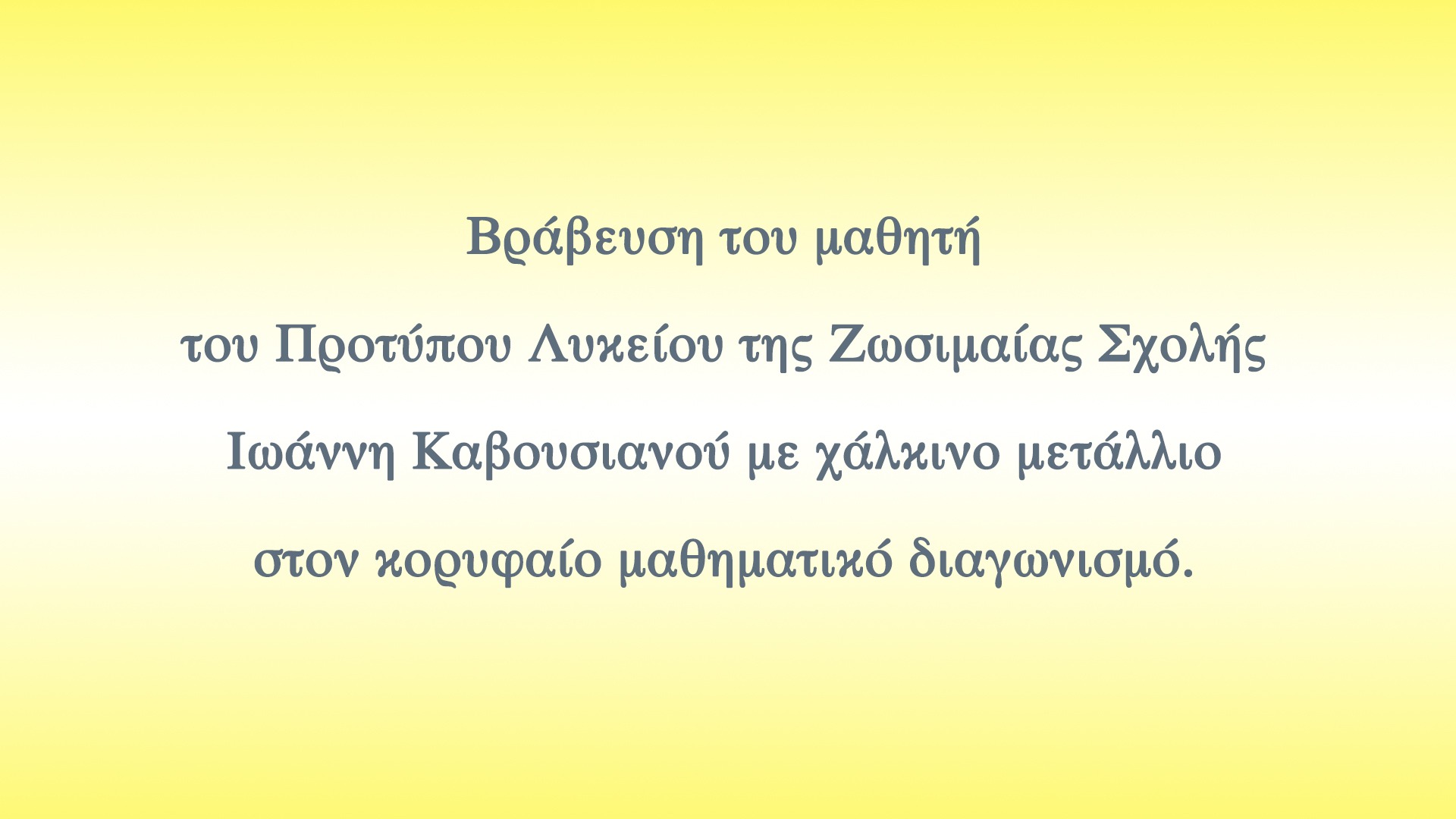 Βράβευση του μαθητή του Προτύπου Λυκείου της Ζωσιμαίας Σχολής Ιωάννη Καβουσιανού με χάλκινο μετάλλιο στον κορυφαίο μαθηματικό διαγωνισμό.