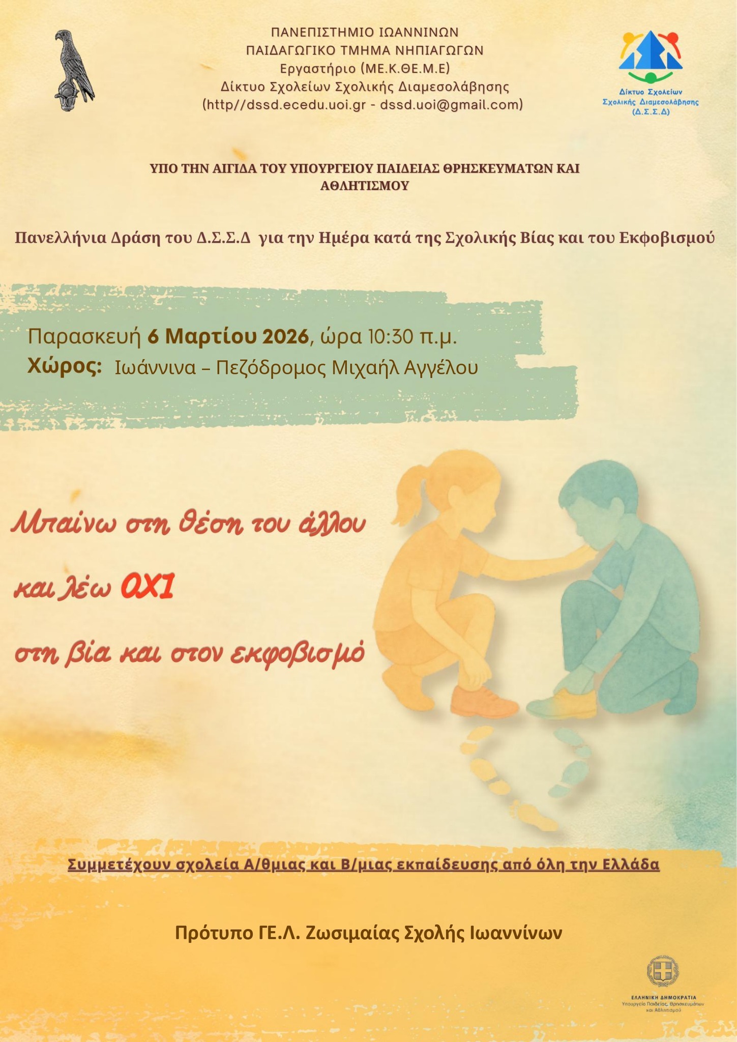 Συμμετοχή του Πρότυπου ΓΕ.Λ. Ζωσιμαίας Σχολής Ιωαννίνων στην Πανελλήνια Δράση του Δικτύου Σχολείων Σχολικής Διαμεσολάβησης ενάντια στη σχολική βία και τον εκφοβισμό.