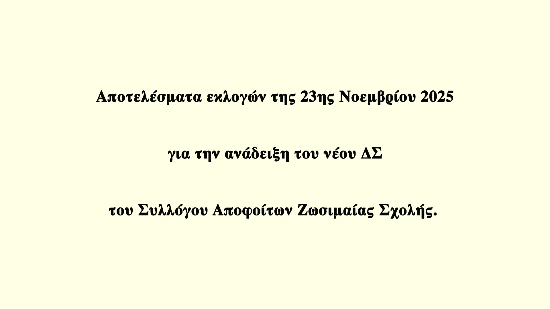 Αποτελέσματα εκλογών της 23ης Νοεμβρίου 2025 για την ανάδειξη του νέου ΔΣ του Συλλόγου Αποφοίτων Ζωσιμαίας Σχολής.