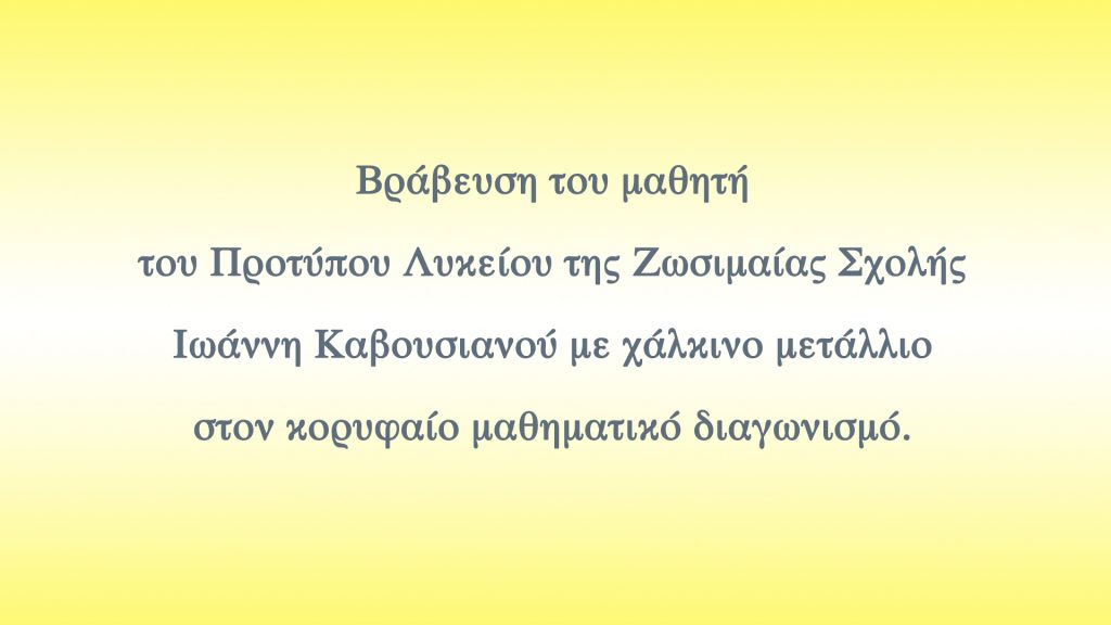 Βράβευση του μαθητή του Προτύπου Λυκείου της Ζωσιμαίας Σχολής Ιωάννη Καβουσιανού με χάλκινο μετάλλιο στον κορυφαίο μαθηματικό διαγωνισμό.